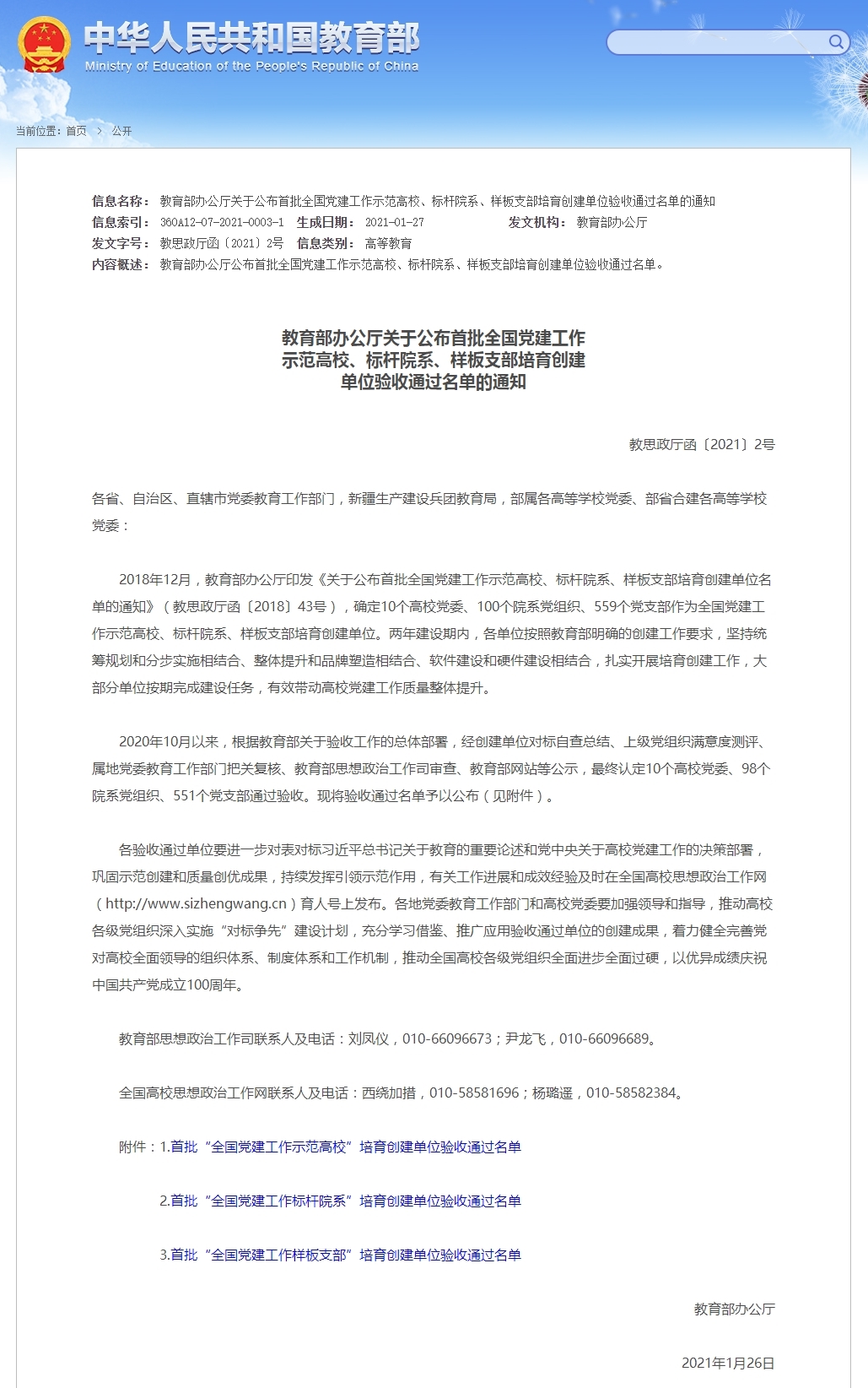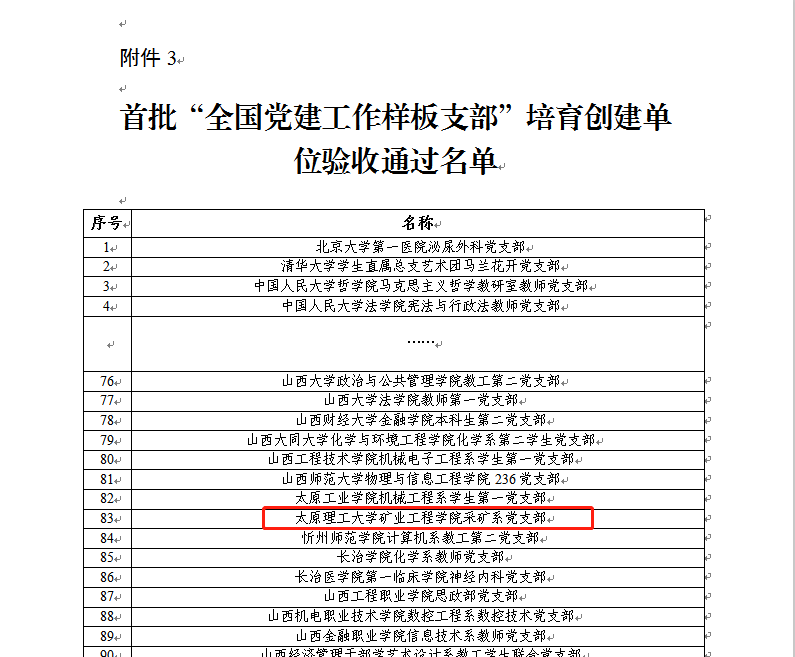 1月26日,教育部思想政治工作司公布了首批全国党建工作示范高校、标杆院系、样板支部培育创建单位验收通过名单,浦京矿业工程学院采矿系党支部位列其中。