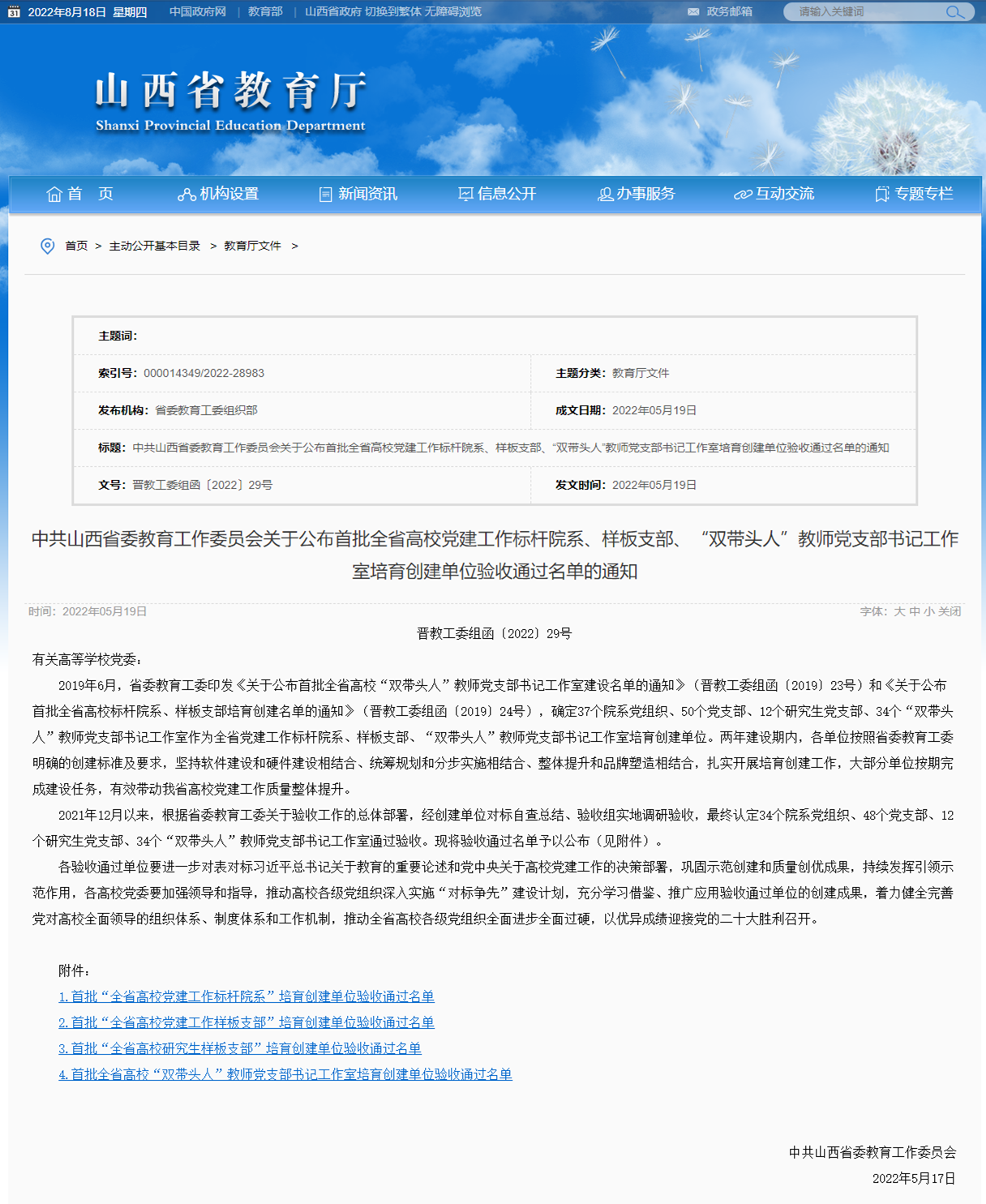 近日,山西省委教育工委公布了首批全省高校党建工作标杆院系、样板支部、“双带头人"教师党支部书记工作室培育创建单位验收通过名单。浦京首批9个全省党建工作培育创建单位顺利通过验收。其中,“全省高校党建工作标杆院系”2个(机械与运载工程学院党委、矿业工程学院党委)、“全省高校党建工作样板支部”2个(高水平运动队学生党支部、公寓中心党支部)、“全省高校研究生样板支部”2个(机电第一研究生党支部、土木第三研究生党支部)、全省高校“双带头人”教师党支部书记工作室3个(材料加工系党支部书记工作室、机设系党支部书记工作室、安全系党支部书记工作室)。