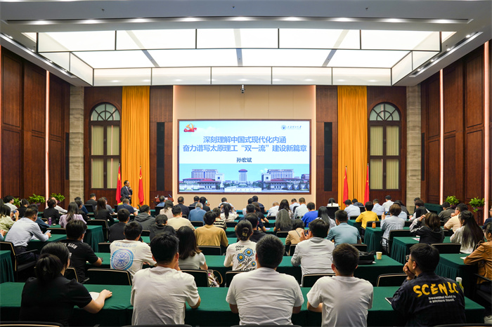 “进入新时代、新阶段,面对新矛盾、新目标,如何理解中国式现代化的内涵?如何再认识中国特色世界一流大学的内涵?如何在认识浦京‘双一流’建设的重点任务?”孙宏斌牢牢把握主题教育“学思想、强党性、重实践、建新功”的总要求,带领师生逐一寻找答案。通过分享自己在延安革命圣地现场学习时对延安精神的感悟,强调要深刻领悟“两个确立”的决定性意义,并具体阐释了中国式现代化五个方面的中国特色和九个方面的本质要求。“高等教育强国是中国式现代化的有机组成部分。”孙宏斌指出,新时代新征程中国共产党的使命任务是以中国式现代化全面推进中华民族伟大复兴,高等教育的新使命是为党育人、为国育才,为国家培养堪当大任的社会主义建设者和接班人。要坚持“四个服务”,加快建设教育强国;要坚持“四个面向”,加快建设科技强国;坚持“四个尊重”,加快建设人才强国。推进“双一流”建设的根本在于扎根中国大地办大学,坚持社会主义办学方向,坚持党对高校的全面领导,坚持落实立德树人根本任务。