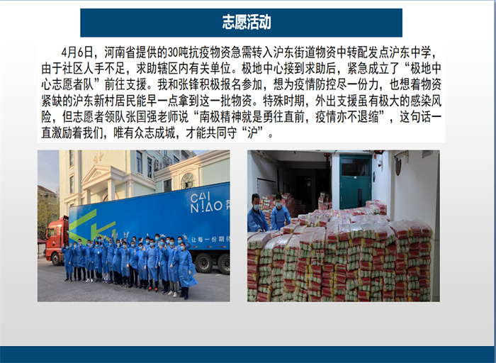支部党员邢治瑞以“中国极地研究中心抗疫侧记”为题,讲述自己在上海疫情防控期间的生活和抗疫感悟。“爱国、拼搏、求实、创新”是南极精神的内涵,也是书写中国极地考察30多年传奇的基石。面对突如其来的疫情,为了确保中国第38次南极考察队稳妥归来,队员平安回家,作为联合培养研究生的邢治瑞积极配合中国极地研究中心提前部署,积极协助极地中心科研团队和业务管理部门开展浦东金桥院区的工作。疫情防控关键时期,河南省提供的30吨抗疫物资急需转入沪东街,社区人手不足,求助辖区内有关单位。极地中心接到求助后,紧急成立了“极地中心志愿者队”前往支援。志愿者队贯彻“疫情当前,党员先上”的信念,诠释着“南极精神就是勇往直前,疫情亦不退缩”的誓言,关键时刻勇于担当、无私奉献。