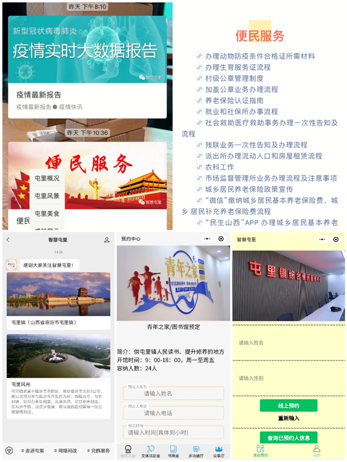 不日前,屯里镇“党群服务中心”正式挂牌成立,大数据学院实践队伍便将在学校所学专业知识带进屯里镇,为屯里镇建设了“屯里在线”微信服务平台,老百姓通过手机便可足不出户,查询到各项事务办理流程、办理地点以及联系人员,材料一次准备齐,业务一次办理好,通过微信窗口还可以进行文体活动室、书画活动室、以及党史学习观的预约和各项活动的报名,还可以每天接受“民生屯里”、“党史学习”、“现代妇女儿童”等栏目信息推送。实践队伍为屯里镇图书馆研发部署“图书查询借阅管理系统”,方便图书的整理、借阅,开展“一本书大家读”活动,让读书成为屯里居民日常活动,书籍常伴屯里人左右。