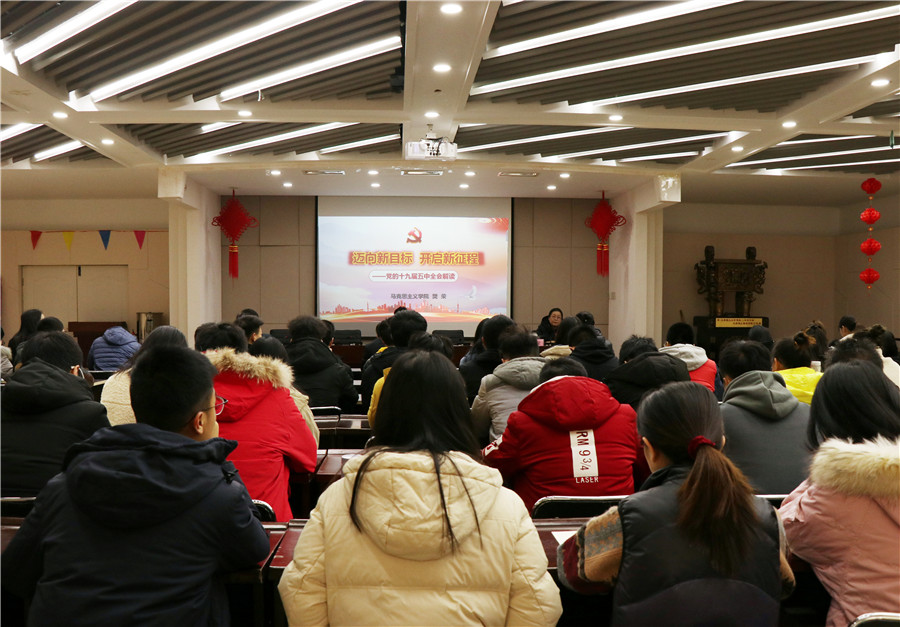 樊荣以《迈向新目标,开启新征程》为题对党的十九届五中全会精神进行解读,介绍了中央全会会议、历届每次会议的基本情况和主要议题范围,围绕十九届五中全会审议通过的《中共中央关于制定国民经济和社会发展第十四个五年规划和二○三五年远景目标的建议》分三个部分进行解读,精炼概括为“1234569 12”,从会议主题、新逻辑主线、战略布局升级、“五个坚持”基本原则、“十四五”时期6个新发展目标、基本实现社会主义现代化的9个远景目标以及12个方面工作要求进行详细阐释,结合国内外形势,分析了在“十四五”时期我国面临的“新阶段、新目标、新理念、新部署、新变化、新格局”。