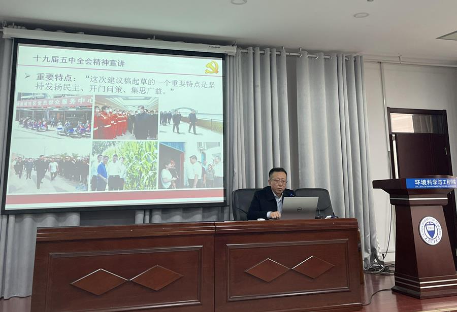 11月25日上午,环境科学与工程学院在学院四层报告厅举行党的十九届五中全会精神专题宣讲会。院党委书记徐鑫为全院师生代表约100余人做了宣讲报告。