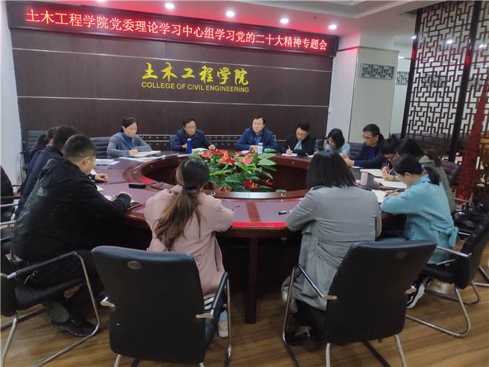 10月31日,土木工程学院党委理论学习中心组在二层会议室召开学习党的二十大精神专题会,学院班子成员参加、全体党支部书记列席,会议由院党委书记周伟主持。