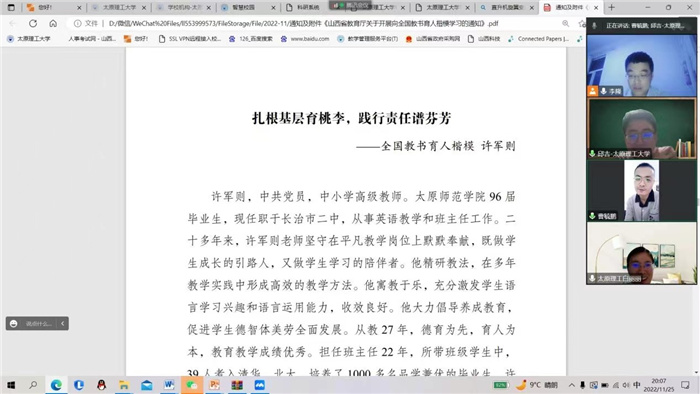 2022年9月,教育部公布了2022年全国教书育人楷模名单,我省晋中市榆次区修文镇中心小学教师范妹锁、长治市第二中学教师许军则和山西机电职业技术学院教师李粉霞等三位教师光荣入选。为进一步激励教职员工学习先进、争当楷模,坚守为党育人、为国育才初心使命,11月23日至26日,航空航天学院以各教研室和三办为单位,组织全体教师开展“践行二十大精神,学习先进事迹,争做育人楷模”的学习、宣传活动。