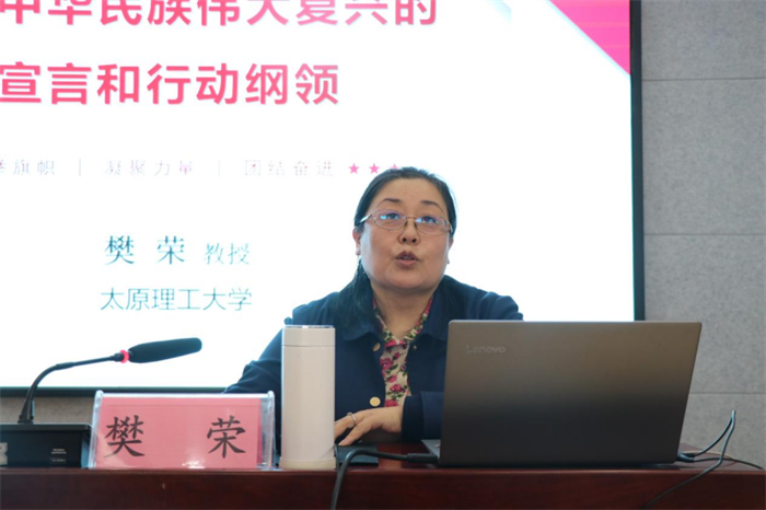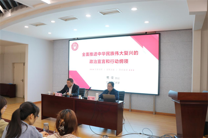 报告会上,樊荣教授从党的二十大报告的总体结构、成就经验、理论指导、使命任务、战略部署、根本保证等六个方面,向参加会议的全体师生全面解读党的二十大报告中过去五年的工作和新时代十年的伟大变革、习近平新时代中国特色社会主义思想的主要内容、世界观和方法论以及贯穿其中的立场观点方法、新时代新征程中国共产党的使命任务,从经济、科教、政治、法治、文化、社会、生态、国家安全、军队建设、祖国统一、外交、党的建设等方面,提出了完成新时代新征程中国共产党使命任务的具体方针政策、坚定不移全面从严治党,深入推进新时代党的建设新的伟大工程等内容,特别强调了党在新时代新征程举什么旗、走什么路、以什么样的精神状态、朝着什么样的目标继续前进,并明确表示全面学习把握落实党的二十大精神的基础是深入理解和把握党的二十大报告的主要内容。