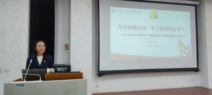 4月20日中午,经济管理学院在学院报告厅为全院学生党员讲授学习贯彻习近平新时代中国特色社会主义思想主题教育专题党课,院党委书记闫新主讲,学院全体学生党支部书记一同聆听了党课。