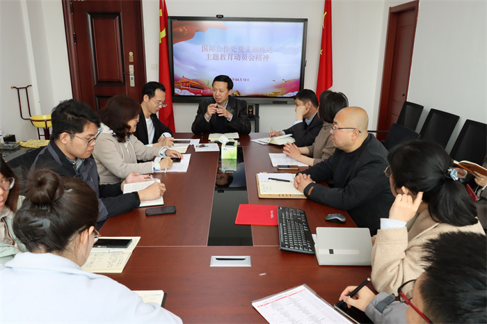 4月18日上午,国际合作处党支部在明向校区行政楼B813室召开会议传达学校学习贯彻习近平新时代中国特色社会主义思想主题教育动员会精神。支部全体党员参加。