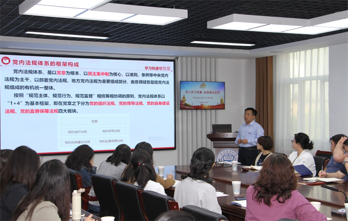 为不断扎实推进学习贯彻习近平新时代中国特色社会主义思想主题教育走深走实,5月15日上午,学生处党支部书记赵国俊在明向校区学生活动中心312会议室以《深入学习党章 加强理论武装》为题讲授专题党课。学生处、武装部全体人员参加。