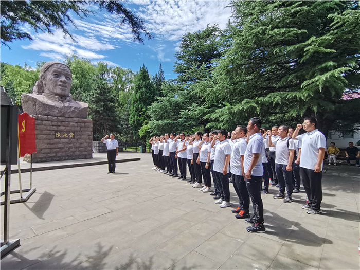 党员们历经两个多小时车程,踏上这片红色热土,追寻红色历史的足迹,追寻那伟大不屈的精神力量。穿过军民池,登上虎头山,参观了周恩来纪念亭、陈永贵墓地、贾进财墓地、郭沫若诗魂碑、大寨文化展示馆、陈永贵故居等红色景点,俯瞰了大寨村容村貌,倾听了首战白驼沟、三战狼窝掌、奋力战洪灾、三不要三不少、搬山填沟造平原、科学种田等历史事迹,深刻领略了陈永贵、郭凤莲等老一辈共产党人的风采以及大寨人的艰苦创业史,感受了大寨人的艰苦创业史和追求幸福生活的执着。在陈永贵塑像前,全体党员在王银兵同志的带领下,面向党旗重温了入党誓词。