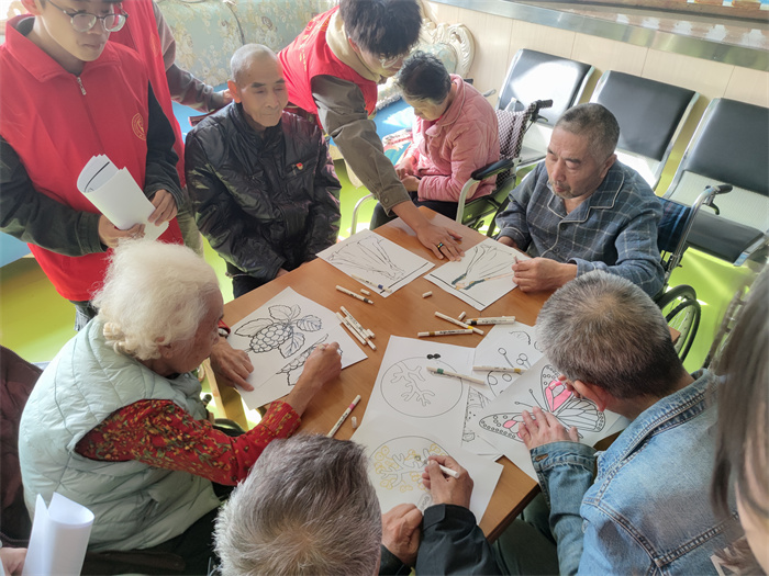 20名志愿者在前往养老院的前一晚进行了培训和准备工作,针对第二天的活动学习了手指舞和艾草健康锤的制作方法。身穿红色马甲的志愿者们到达养老院给这里带来了一抹靓丽的风景,为老人们送上了亲切的问候和祝福。随后志愿者们陪同老人们进行了丰富多样的互动,老人们在志愿者的指导下学习做手指保健操,挑选出喜欢的简笔画在志愿者的帮助下进行涂色绘画,其中一位老人在绘画作品中写下了老伴的名字让志愿者们深受感动,老人们纷纷拿起自己的作品和志愿者合影留念,志愿者也将一同制作的艾草健康锤赠予了他们。