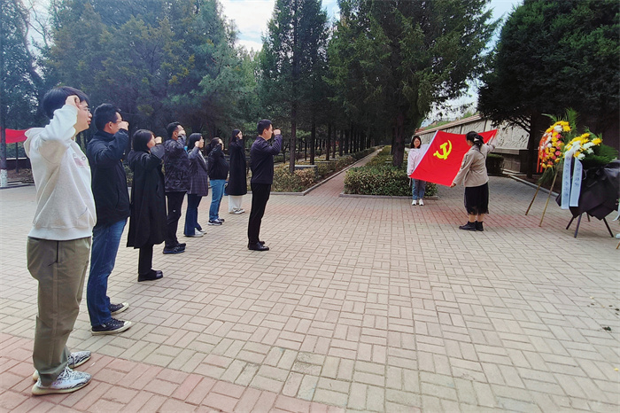 烈士陵园松柏环绕、庄严肃穆,全体党员缓步绕行,瞻仰烈士纪念碑。在解放太原战役纪念墙前,全体党员肃立默哀,敬献白菊,缅怀逝者,寄托哀思。面向鲜红的党旗,全体党员高举右手,重温入党誓词,共同表达对党忠诚、为党和人民努力奋斗的意志和决心。