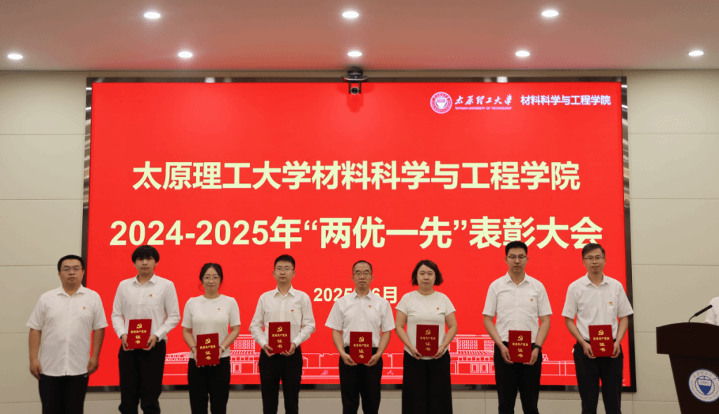 为庆祝中国共产党成立104周年,表彰先进、树立典型,激励全院基层党组织和广大党员奋勇争先、再创佳绩,6月30日下午,材料学院在迎西校区会议中心隆重举行2024-2025年“两优一先”表彰大会。学院党委书记游志勇、副院长牛晓峰及各党支部书记、受表彰的先进集体与个人代表以及2025年全体新发展党员参加了大会。大会由学院党委副书记郑芳同志主持。