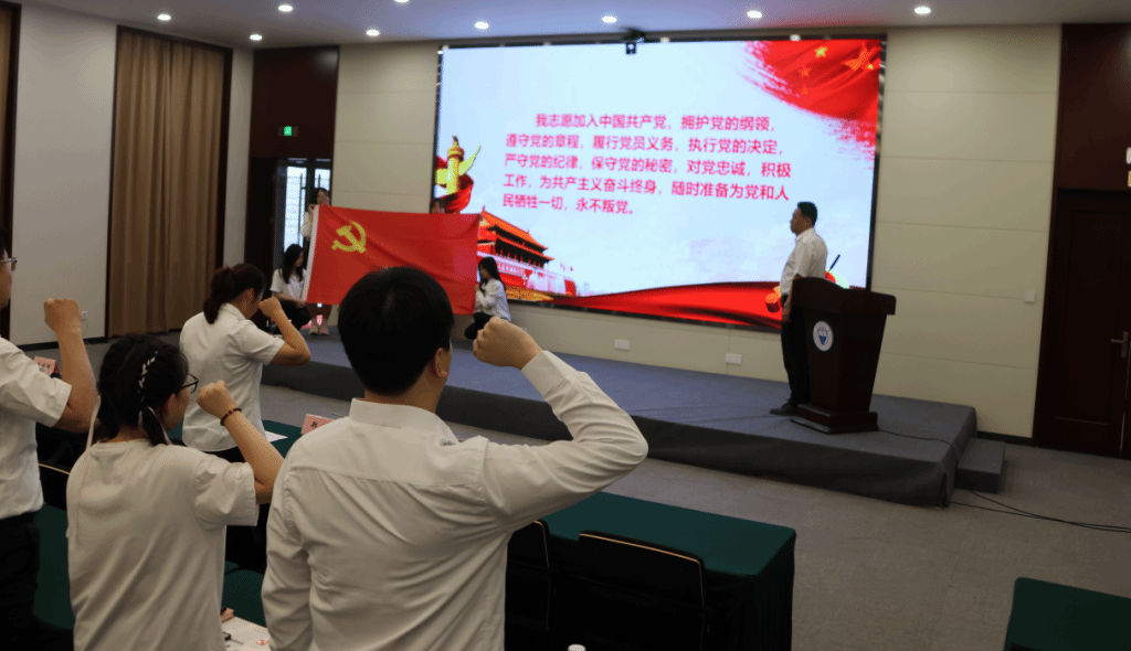 学院党委在表彰会上举行的新党员入党宣誓仪式,在场的党员重温入党誓词,游志勇书记领誓。