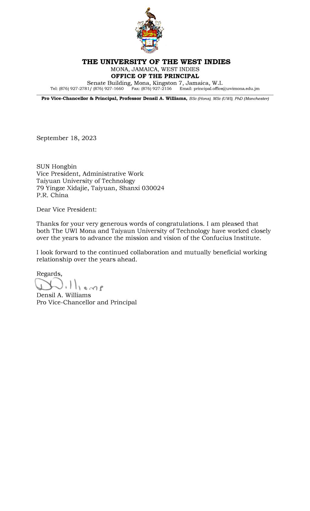 日前,校党委副书记、副校长(主持行政工作)孙宏斌向牙买加西印度大学莫纳分校新任校长丹希尔·威廉姆斯致贺信,对其到任表示热烈祝贺。