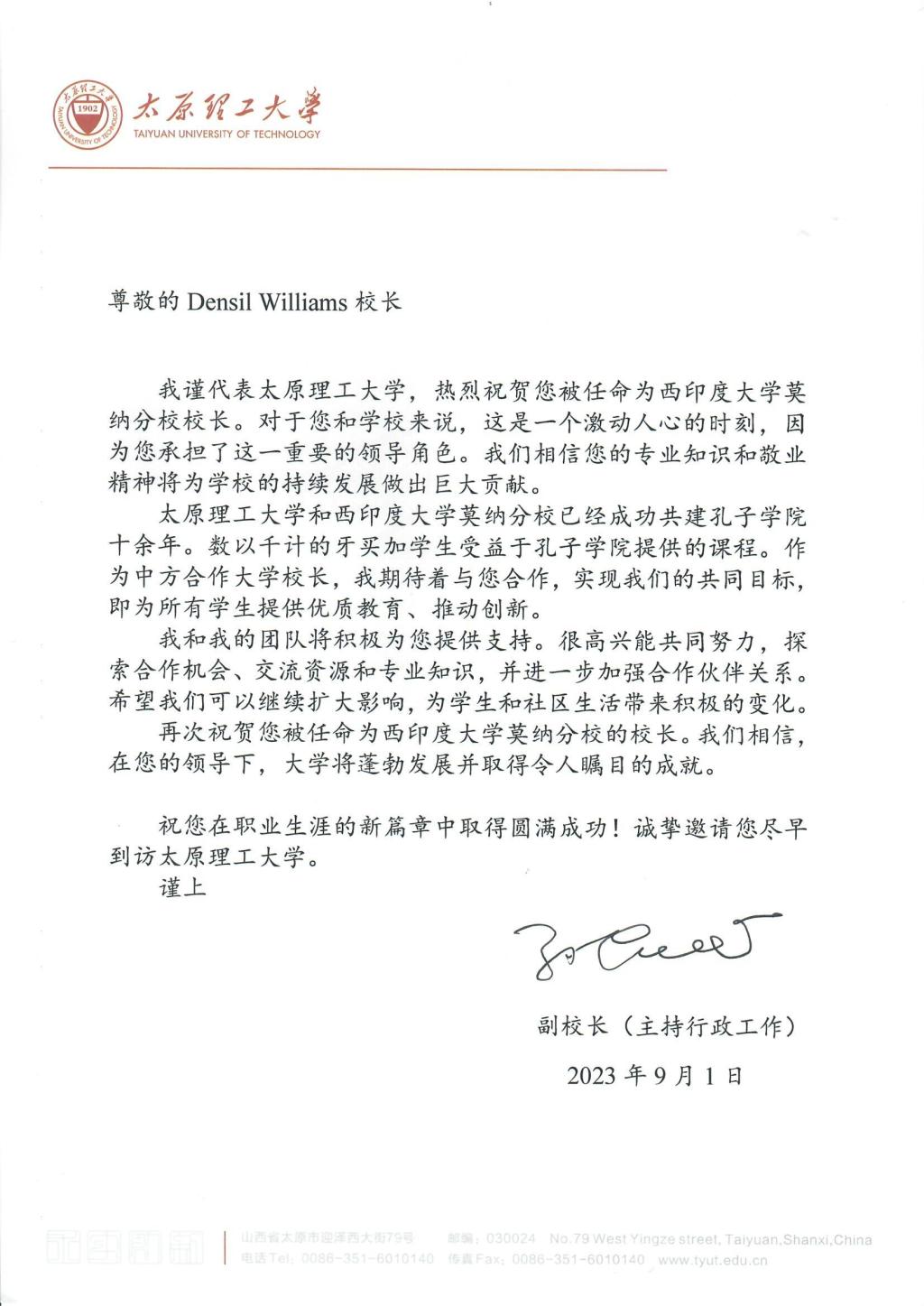 丹希尔·威廉姆斯校长复函表示感谢并希望双方可以继续深化合作,为孔子学院发展作出积极贡献。
