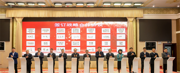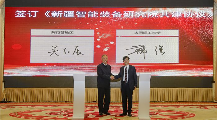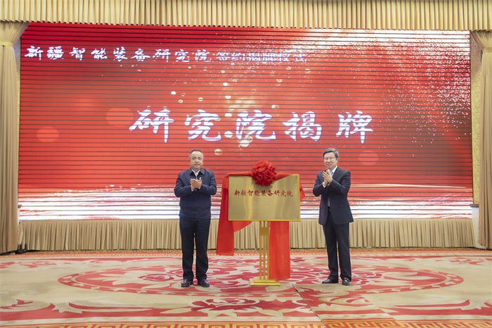 郑强书记代表学校分别与凯赛尔·阿不都克热木副主席、吴红展书记签署共建协议;中国工程院院士、新疆智能装备研究院首任院长、浦京黄庆学教授与新疆自治区相关企业、高校签订合作协议;艾尔肯·吐尼亚孜主席与中国工程院院士、浦京金智新教授共同为新疆智能装备研究院揭牌。