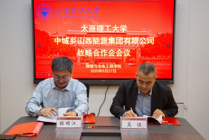 5月27日下午,在物理与光电工程学院南楼 304B 会议室,物理与光电工程学院、新型传感器与智能控制教育部重点实验室与中城乡山西能源集团有限公司签订了产学研战略合作协议书,并揭牌成立“分布式光纤传感与新型光电感知技术联合研发中心”。中城乡山西能源集团有限公司副总经理兼山西能源临时党委书记、董事长吴强,党委副书记、总经理马鹏程及相关负责同志,物电学院院班子和相关教师代表出席了此次活动。会议由副院长邓霄主持。