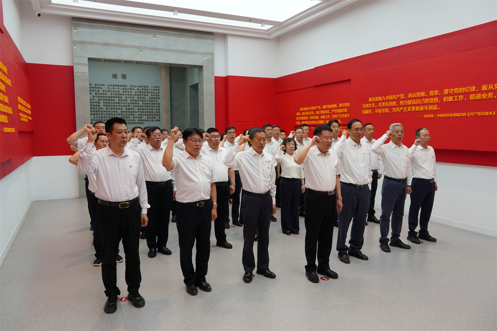 参观最后,校党委书记沈兴全带领全体党员干部面向党旗,举起右拳,重温入党誓词。