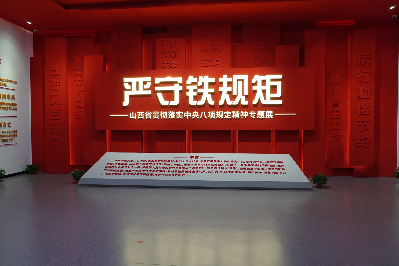 “严守铁规矩”专题展,分为“铁规矩、金名片”“纠四风、治顽疾”“好作风、新征程”三章内容,通过图文介绍、视频展示、多媒体互动等多种形式,系统回顾党的十八大以来以习近平同志为核心的党中央推进全面从严治党取得的历史性、开创性成就,深刻感悟省委持续加固中央八项规定堤坝、锲而不舍纠“四风”树新风,打好作风建设攻坚战持久战的坚定决心。