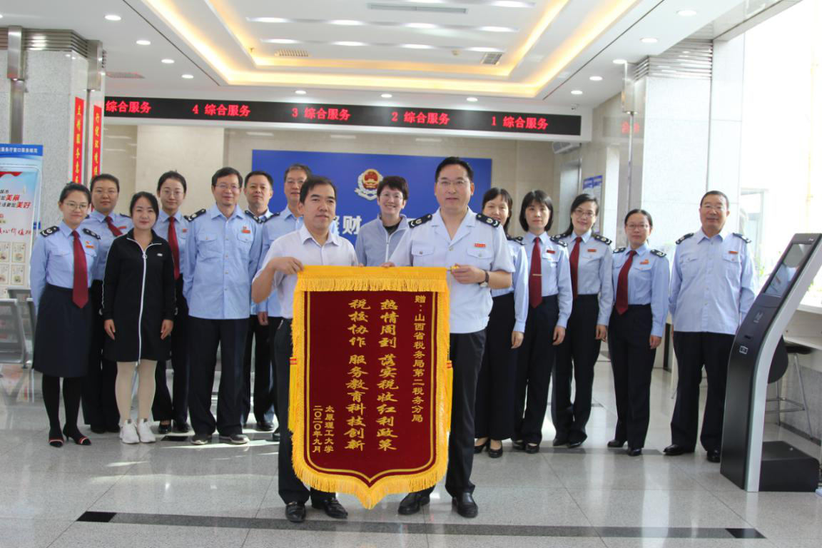 9月24日上午,财务部副部长季宏宇等三人,代表学校,怀着感谢之情,把绣有“热情周到,落实税收红利政策;税校协作,服务教育科技创新”的锦旗送到山西省税务局第二税务分局,以此感谢省二分局的领导及工作人员排忧解难的工作热情和敬业精神。