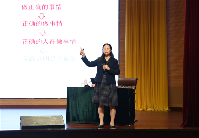 随后,段鑫星教授作了题为《导学关系融洽心理效应与调节》的报告。段鑫的报告从新时代背景下导学关系要求、导学关系的现状、良好导学关系的建构、师生共进彼此成就等四个方面,结合自身多年来当导师带研究生的经历,提出导师应主动关注研究生个体的成长和思想状况,促进研究生心理健康发展,就导师如何与研究生沟通交流,如何化解学术、个性、心理冲突等问题给出了建议,她提出,合理恰当的方法,能够让导师与学生相互成长,双向成就,实现双赢。段鑫星的讲座内容丰富多彩、语言生动幽默且富有哲理性,受到了现场导师们的欢迎。