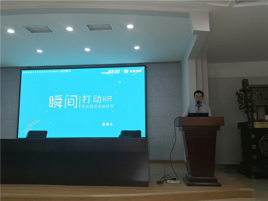 讲座初始,董德北老师通过“谁能站到最后”的知识问答环节告诉学生简历撰写应包含的必要因素,指出一份优秀的简历应从内容、措辞、排版等三方面进行考量。接着老师运用生动的例子强调了动词、数字合理运用的重要性,指出所列举的简历样式中出现的问题并提出改正措施,告诉学生们简历的投递应当“有的放矢”,杜绝“以一概全”的现象。