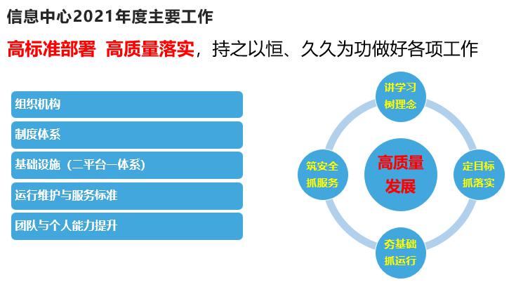 会上,杨静作了题为《奋力推动网络与信息化高质量发展开局》的报告。围绕高标准部署和高质量落实,从网络与信息化制度体系的建立与完善、基础设施(二平台一体系)建设、运维体系构建、标准服务打造和团队能力提升等方面介绍了发展思路和工作安排。