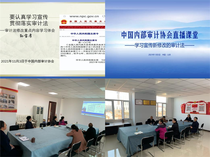11月3日上午,审计处全体人员在明向校区行政楼B506室参加“中国内部审计协会直播课堂——学习宣传新修改的《审计法在线视频讲座。本次讲座由中国审计学会会长孙宝厚同志主讲,题目为《要认真学习宣传贯彻落实审计法——审计法修改重点内容学习体会》。