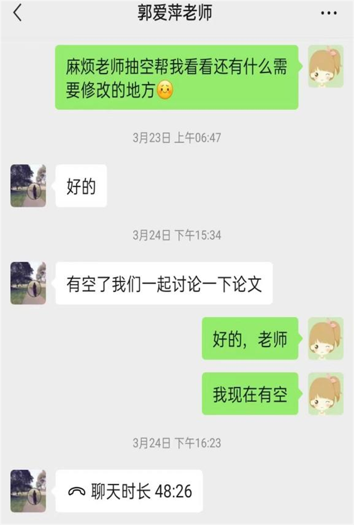 19级外国语言文学专业廉紫蓉同学说到,“疫情期间,郭爱萍老师常常通过微信电话指导我们论文写作,督促我们学习不懈怠。长达70多页的全英论文,发给老师后往往两三天便可得到反馈。从论文标题到结构层次再到参考文献,老师的指导细致全面,给予我非常多的帮助。虽然因为疫情不能返校,但导师的关心督促仍旧不变,时时刻刻激励着我。”