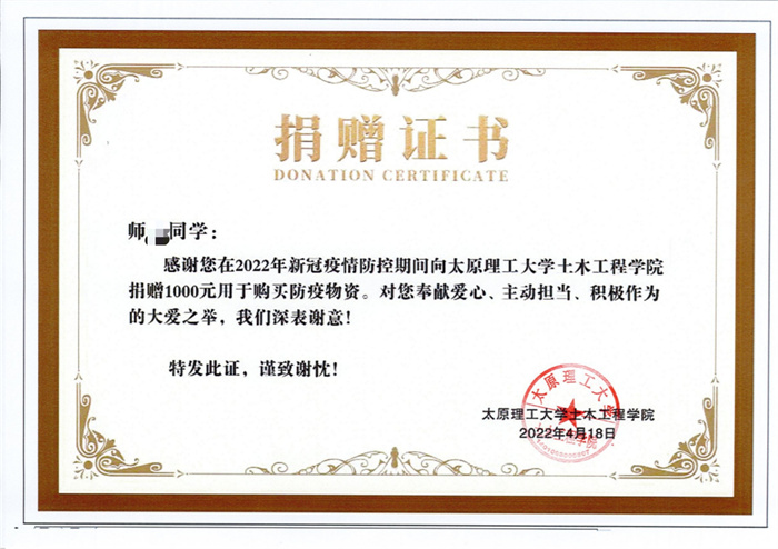 学院在收到捐款后立即组织开展口罩等防疫物资的采购工作,同时对师同学表示由衷的感谢,并颁发捐赠证书。