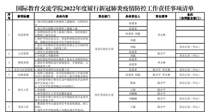 强化组织建设,明确防控责任。按照学校要求,学院于4月7日立即召开专题会议,成立“疫情防控专项工作组”,在明向、迎西两校区建立“院领导-办公室(中心)负责人-辅导员(班主任)-国际学生代表”四级联动机制,制订《履行疫情防控工作主体责任事项清单》,公布“疫情期间学院办公联络方式”,全体师生职责明确,各项工作井然有序。