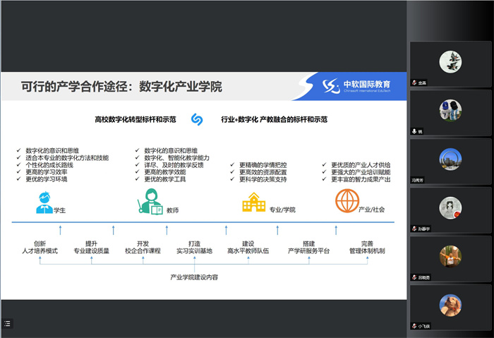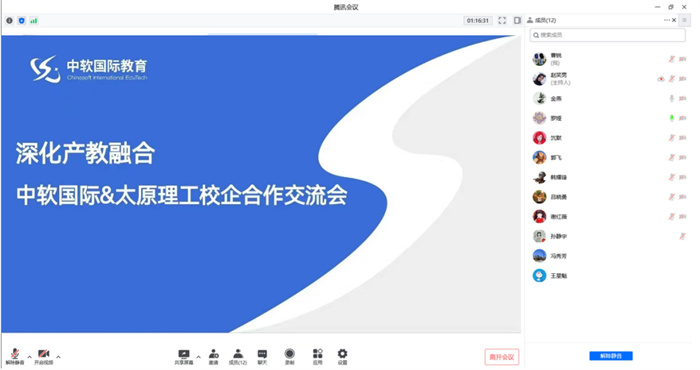 4月13日,软件学院与中软国际教育集团召开校企合作交流会,由于受到疫情的影响,会议通过腾讯会议在线上召开。中软国际教育集团副总裁、产学业务线总经理罗娅、教学主管韩耀锋,软件学院院长金燕、党委副书记吕晓勇、副院长冯秀芳、副院长曹锐,以及系部负责人参加了本次交流会。