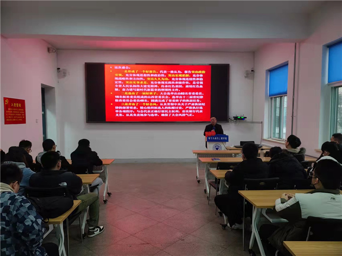 徐鑫首先传达了中国共产党山西省第十二次代表大会精神,他从十八大以来习近平总书记三次视察山西讲起,沿着时间脉络剖析了山西实现开创新局的根本在于习近平新时代中国特色社会主义思想的科学指引。他要求师生在思想上要坚决拥护“两个确立”,不断增强“四个意识”,坚定“四个自信”,做到“两个维护”。徐鑫在传达了省委十二届二次、三次会议以及浦京第三次党代会精神后,号召师生要掀起深入学习贯彻习近平总书记考察调研山西重要指示精神的热潮,牢记领袖嘱托、全方位推动高质量发展,以实际行动为推动山西发展进入新境界、开辟新天地贡献智慧和力量。徐鑫鼓励学生干部要做好老师和同学之间的桥梁纽带,努力学习,提升综合素质,经过大学的磨练,早日成为国家栋梁。随后,他强调了当前疫情防控的重要性,希望同学们不信谣、不传谣,自觉遵守校纪校规,做到人人防疫、防疫有我。