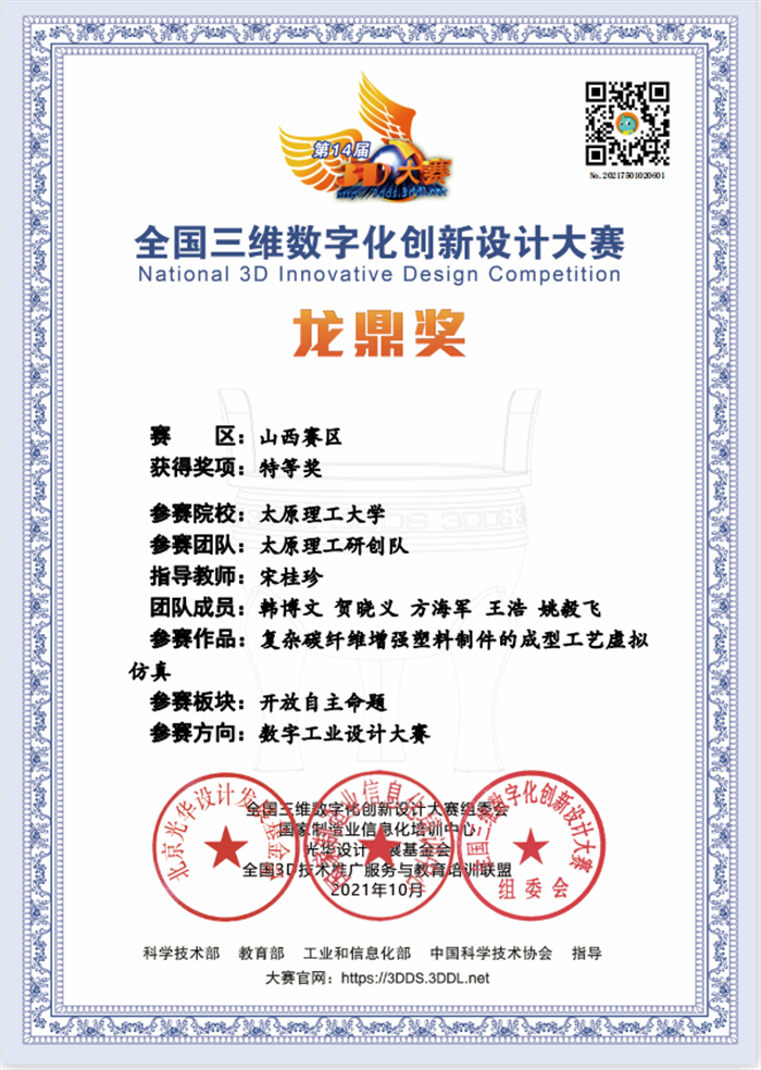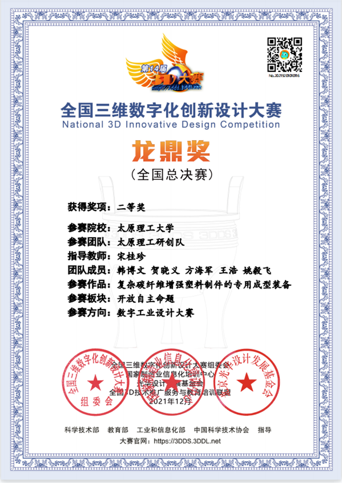 2021年第14届全国三维数字化创新设计大赛首次设置研究生组。由于疫情的原因,本届大赛在线上进行。从2021年5月起,至2021年12月,经网络海选、初赛、赛区复赛、全国总决赛四个阶段。宋桂珍老师指导的参赛作品“复杂碳纤维增强塑料制件的成型工艺虚拟仿真”,在山西赛区(包括晋蒙秦三地)353项复赛作品中荣获特等奖,成功晋级全国总决赛;作品“复杂碳纤维增强塑料制件的专用成型装备”在800支决赛队伍的激烈角逐中荣获全国总决赛二等奖。