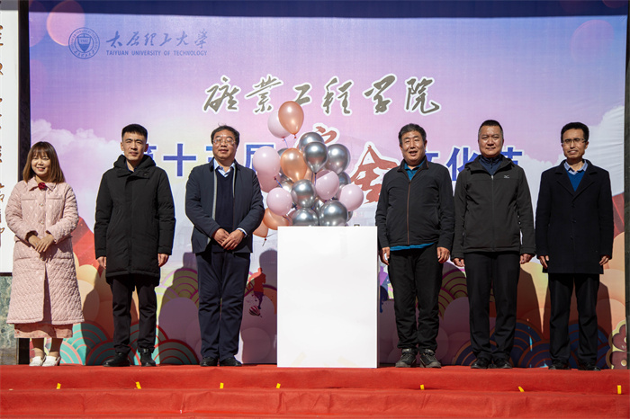 各位领导和嘉宾于礼盒前拉动红布放飞气球,矿业工程学院第十三届“宿舍文化节”正式启动。