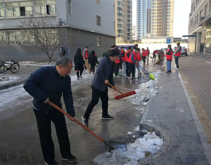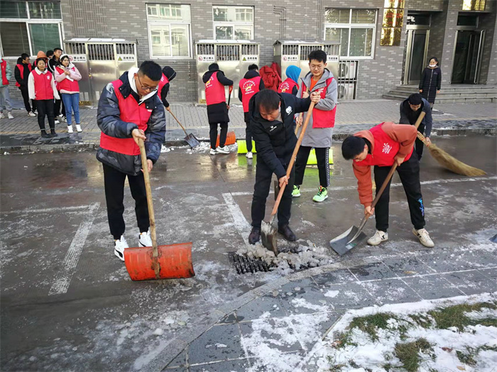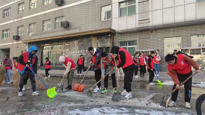 除雪现场,志愿者们身穿“红马甲”,纷纷拿起铁锹、雪铲、扫帚等劳动工具,铲的铲、扫的扫,默契配合,干得热火朝天,忙碌的身影构成了校园里一道亮丽的风景线。王正强等党员干部也手拿工具,与志愿者们一同铲雪,道路湿滑,减退不了志愿者们扫雪的热情,抵挡不住为师生服务的暖心。经过一个多小时的清理打扫,路面结冰得以清除,门前也恢复了整洁。