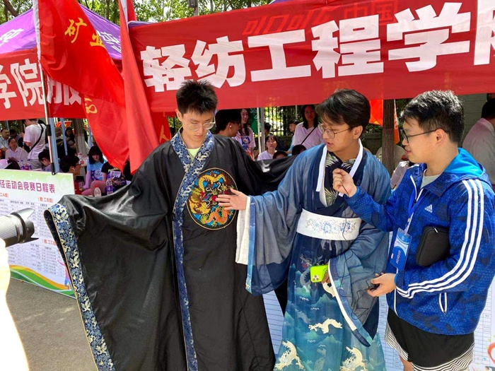 越罗衫袂迎春风,玉刻麒麟腰带红。为了传播传统文化,展现汉服魅力,发挥传统服装服饰文化的美育作用,5月28日至29日,轻纺工程学院今信文化创意园思政教育示范基地在校运会大本营开展了“汉服打卡”活动。