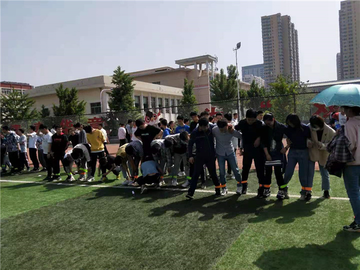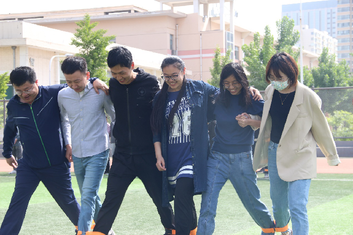 运动会共设七个项目,分别为:六人七足、双腿夹球接力,驰骋沙场,背对背夹球跑,跳长绳,“瞎子”背“瘸子”接力赛,传面粉。最先开始的是跳长绳项目,各班级选手们以“8”字型连续跳的方式计数,在5分钟时间内完成数量多者获胜。在团体项目六人七足中,六名选手通过绑带依次将小腿捆绑,选手们齐心协力跑完全程。比赛过程中,辅导员们也积极参与其中,为所加入的班级代表队拼尽全力。老师们也现场组成小队,和学生们并肩竞技,赛场上气氛高涨,欢笑连连。