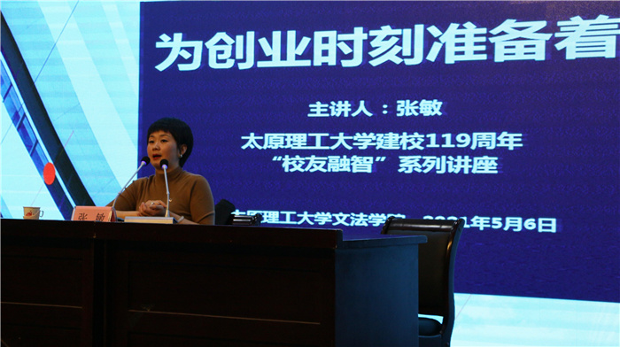 5月6日下午,文法学院法学系优秀校友张敏应邀到学院院作题为《为创业时刻准备着》的励志讲座,本次讲座是350vip浦京集团官网建校119周年“校友融智”系列讲座之一。讲座由文法学院副院长杨建华主持,校友办副主任康喜兴及我院2017级、2018级学生参加了本次讲座。