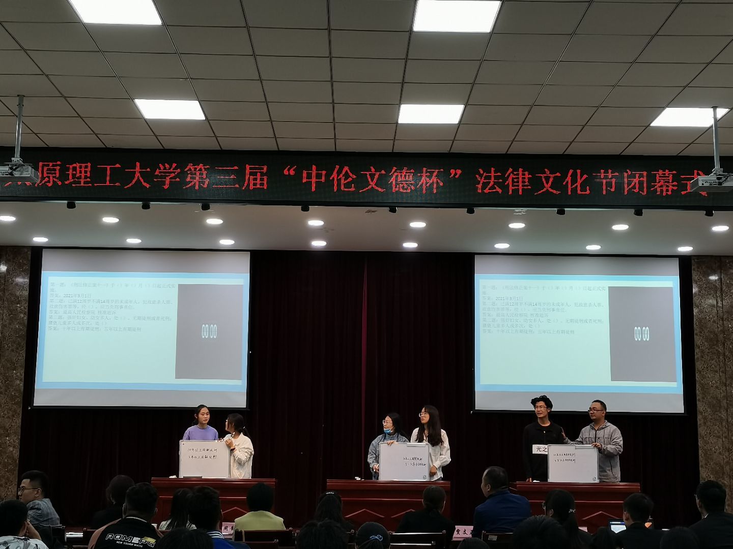 为响应党中央关于全面推进依法治国的号召,激发青年学生的主动性、创造性,5月6日晚,浦京第三届中伦文德杯“法系理工 律动校园”法律文化节闭幕式在文法学院模拟法庭举行。学生工作部副部长李和凤,校团委副书记贾支正,文法学院副院长杨建华、法学系主任张振宇等老师出席了本次活动。