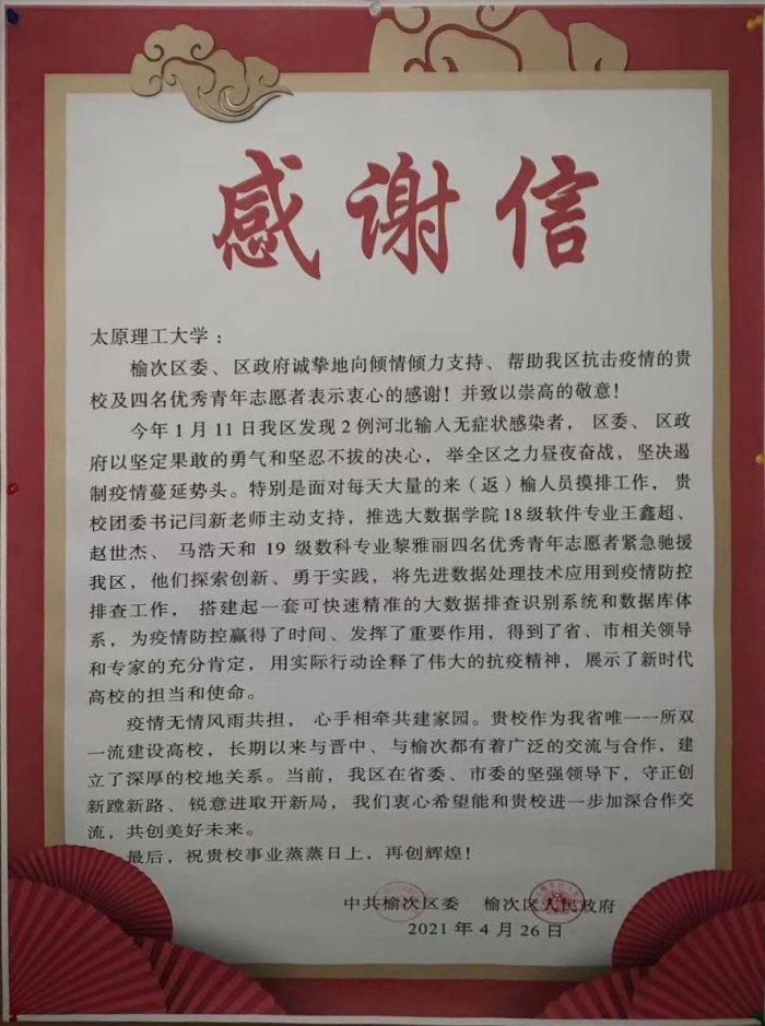 项目小组成员王鑫超表示,感谢榆次区政府对项目小组志愿服务工作的认可,感谢学校提供的志愿服务机会,在疫情防控志愿服务期间,我们看到了太多默默付出的人,我们感受到了上下级各部门的责任与担当,疫情当前,所有人都团结一心,共克时艰。这不仅仅是一次志愿服务经历,更是一场生动的战“疫”思政教育大课,在这节课中我们学到了很多,收获了很多。