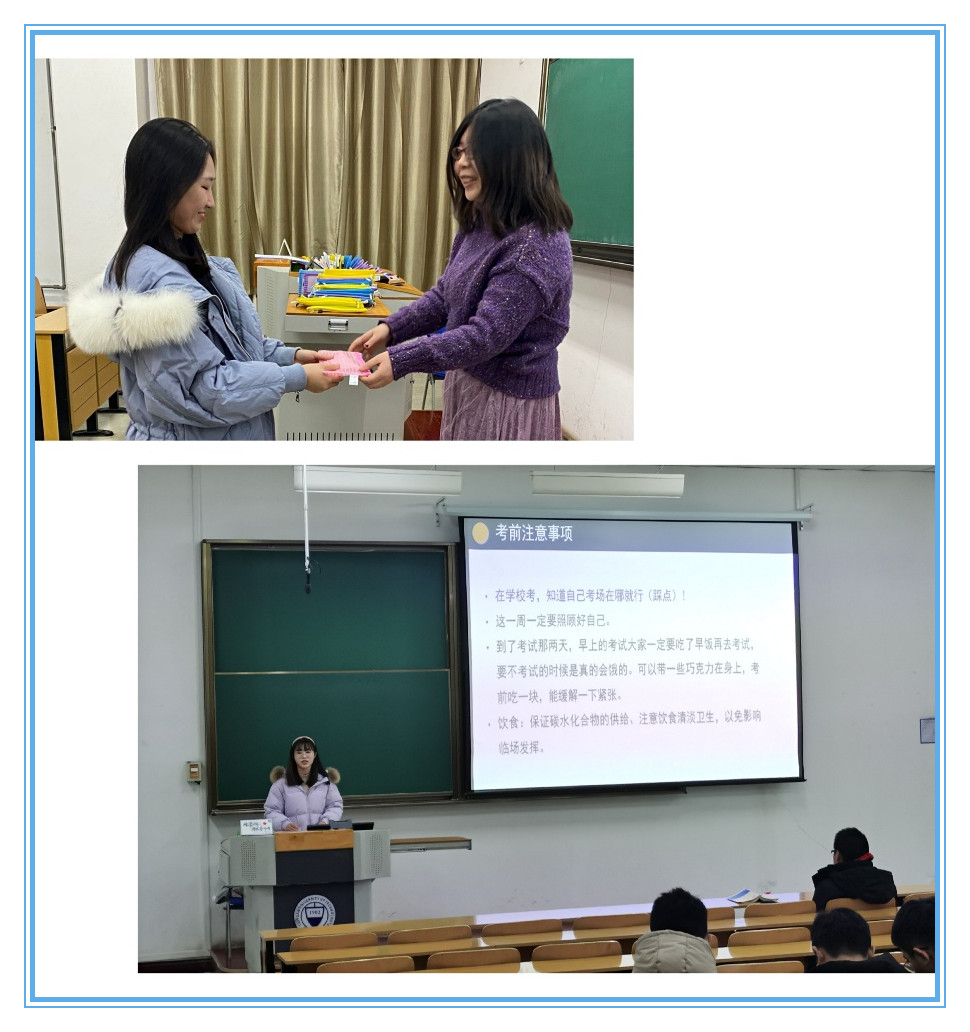 活动中,毕业班辅导员向全体同学表达了关怀与慰问,鼓励同学们一定要抓住这最后的时间,奋力一搏,所有的努力一定都会获得回报,希望大家得偿所愿,一战成硕。在经验分享环节,邀请了2020届毕业生、2020级研究生余娩霞同学,为大家做主题为“一‘研’为定”的考研冲刺经验交流,内容涉及考场用品清单、考研前一周复习建议、考前(时)注意事项等。此外,辅导员为每一位考研学子送上学院精心准备的考研加油包,其中包括一个笔袋,一支彩笔,一封来自辅导员的祝福信,折叠成帆船的形状,寓意着“一帆风顺”。活动结束后,同学们纷纷表示,学院的暖心举动,舒缓了紧张心情,也增强了自信心,相信定能蟾宫折桂、不负坚持。