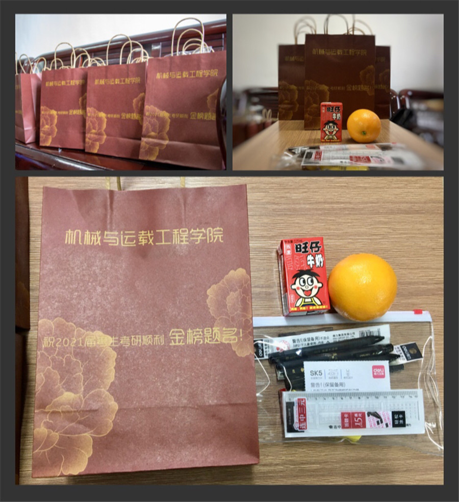 寒风凛冽时,温情暖人心。活动结束后,老师们走进学生宿舍,陆续为500余名机械学子送去精心准备的考研助力福袋,希望大家“脐”开得胜,心想事“橙”,“牛”气冲天。