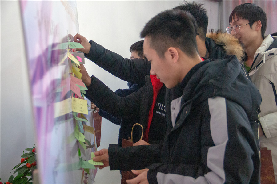 文具礼包、脐橙、牛奶、心愿便利贴……这些加油物品寄托了学院深深的祝福。活动上,领导和老师们为考生代表发放了福袋,一起写下祝福的话语,贴在“考研助力墙”上。老师们还提前收集了学弟学妹们的加油话语和暖心祝福,助力学长学姐成功上岸。