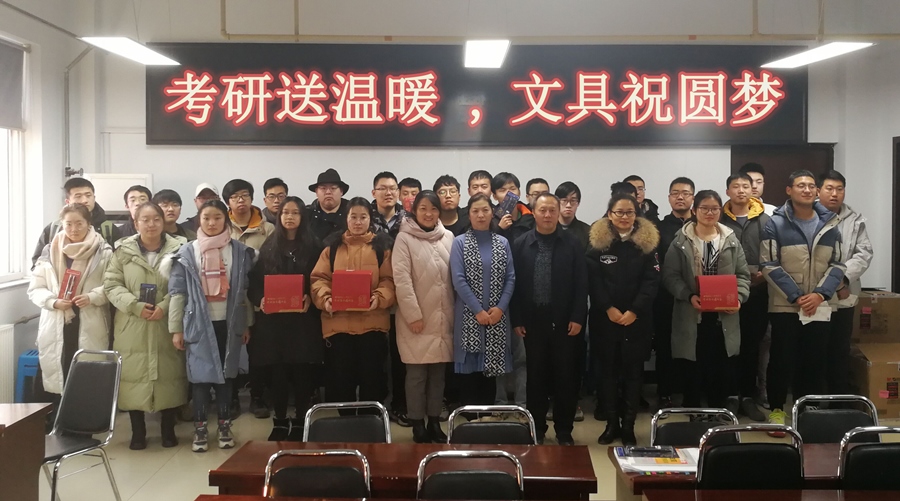 活动中,王正强肯定了考研学子一年来的辛苦付出,鼓励同学们充满理想、坚定信念,将考研坚持到最后,同时要劳逸结合、放松心情,以最好的状态迎接考研。随后,王正强、王晓敏、郑芳、白小芳代表全院师生将学院精心准备的考研祝福礼包送到考研学生手中,并送上真诚的考研祝福语,同时为学生们加油打气。在交流中,王晓敏叮嘱广大同学在最后的冲刺阶段一定不能松懈,遇到问题要及时和老师沟通,同时也要注意保暖,以最好的状态迎接考试。最后王晓敏嘱咐大家“坚持就是胜利”,学院相信所有的付出和努力一定会得到回报,同时祝各位同学在考试中取得优异的成绩。在考研冲刺阶段,同学们纷纷真切感受到了来自学院的温暖,相信有全院师生作为自己强大的后盾为自己加油助威,一定会在即将到来的考试中发挥出自己最好的水平。活动现场温馨感人、气氛高涨。