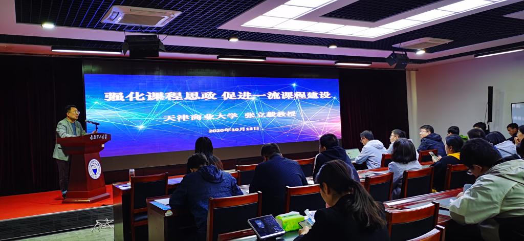张立毅作了题为“强化课程思政,促进一流课程建设”的报告,报告主要包括“是什么—课程思政和一流课程定义”、“为什么—课程思政和一流课程的意义”、“做什么—课程思政和一流课程的做法”等三个方面。张教授从课程思政和一流课程的定义出发,阐述了二者的本质与关系,给出了课程目标、教学内容以及课程设计等方面教师需要突破的难点,并结合《教育部关于一流本科课程建设的实施意见》的总思想,以“课程是人才培养的核心要素,课程质量直接决定人才培养质量”为中心,提出了课程思政和一流课程建设应该达到的效果。最后,张立毅作为“通信原理”天津市新时代课程思政改革精品课和一流建设课程的主讲教师结合自己实际的建设案例强调了课程思政和一流课程建设的内容、思路以及建设的重点,旨在希望各位教师在教学过程要建设好课程、挖掘好思政元素。