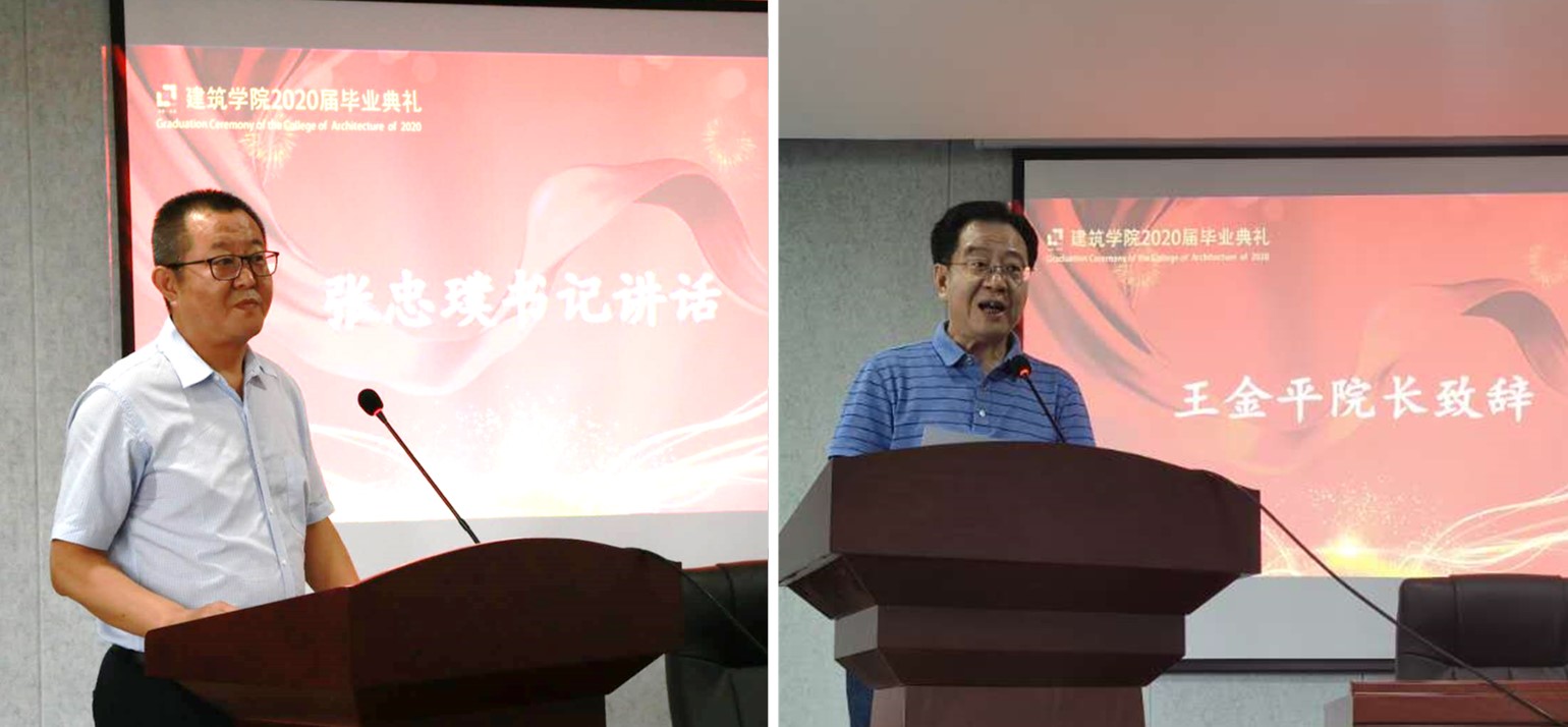 典礼在庄严的国歌声中拉开帷幕。院长王金平作题为“勇敢担当,学在路上”的致辞,希望同学们保持勇于尝试的习惯、坚守努力奋斗的信念、记住“建德、筑魂”的院训,肩负新的使命,开启新的旅程。学院建筑系、城乡规划与风景园林系、工业设计系的三位系主任康峰、董艳平、刘慧喜以及博士生导师高宇波作为教师代表发言,祝愿同学们在未来的人生道路上,都能够继续以独立、质疑、求新的态度探寻真理、获取真知,并祝贺同学们顺利毕业。