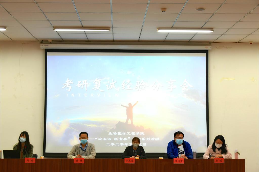 5月5日上午,生物医学工程学院考研复试经验分享会在我院一楼报告厅成功举办,会议邀请院党委副书记李昱霞、生物与制药工程系主任常宏宏、生物医学工程系主任黄棣、生物力学教研室主任郭媛作为主讲老师为准备参加线上复试同学们答疑解惑,本次会议由辅导员刘颖主持。