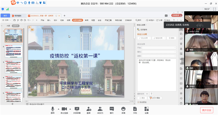 4月15日,环工学院党委书记徐鑫、院长岳秀萍通过线上线下的方式,为毕业生讲授题为《讲好战“疫”故事,彰显中国力量》的返校第一课及《将国家总体安全观贯穿战“疫”全过程》的宣讲。党委副书记钟明涛、学工办、团委负责人和全体辅导员一同聆听。